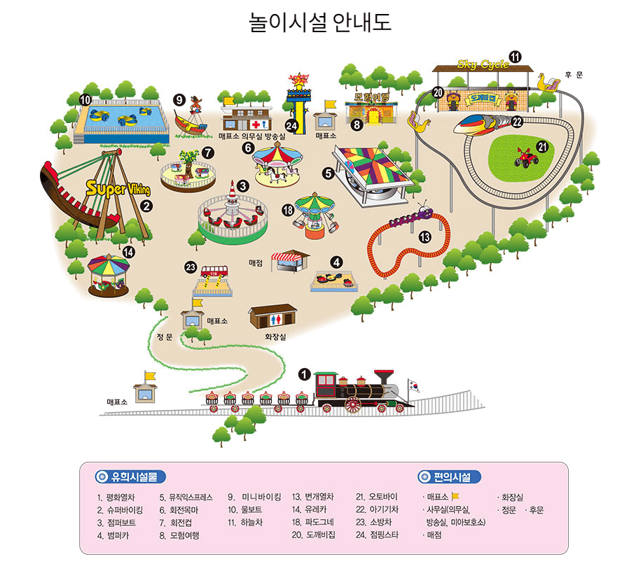 24개의 유희 시설물과 편의시설을 갖추고 있다 대부분의 놀이기구는 아이들을 위한 놀이기구이지만 남녀노소 즐거운 시간을 보낼 수 있는 곳이다