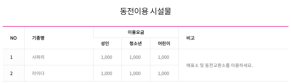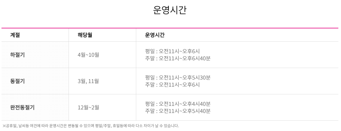 평일 주말 상관없이 이용이 가능하며 오전 11시부터 하절기 동절기에 따라서 폐장시간은 다르다