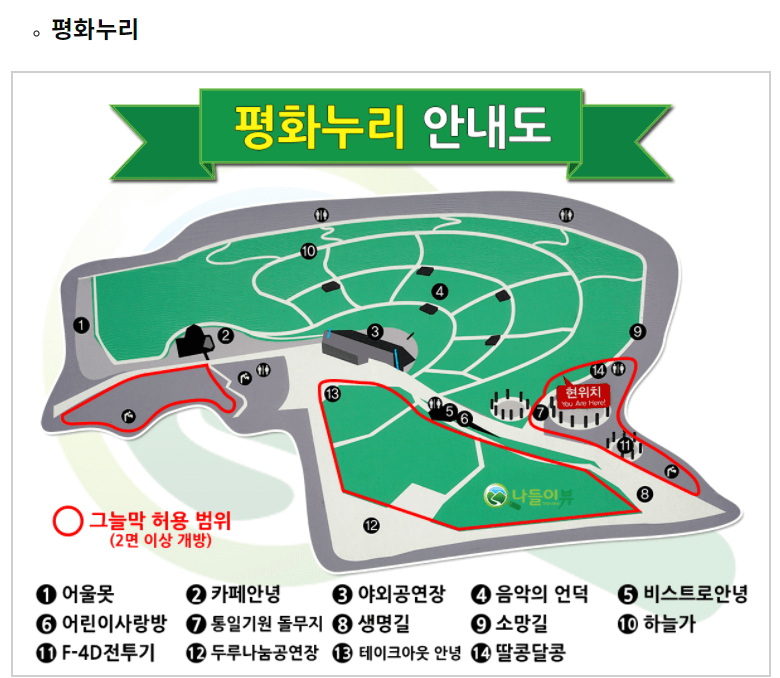 주차장 입구를 기준으로 입구에 평화랜드 정면에 전망대 우측에는 큰 원형의 잔디밭의 평화누리 공원이 위치해 있다